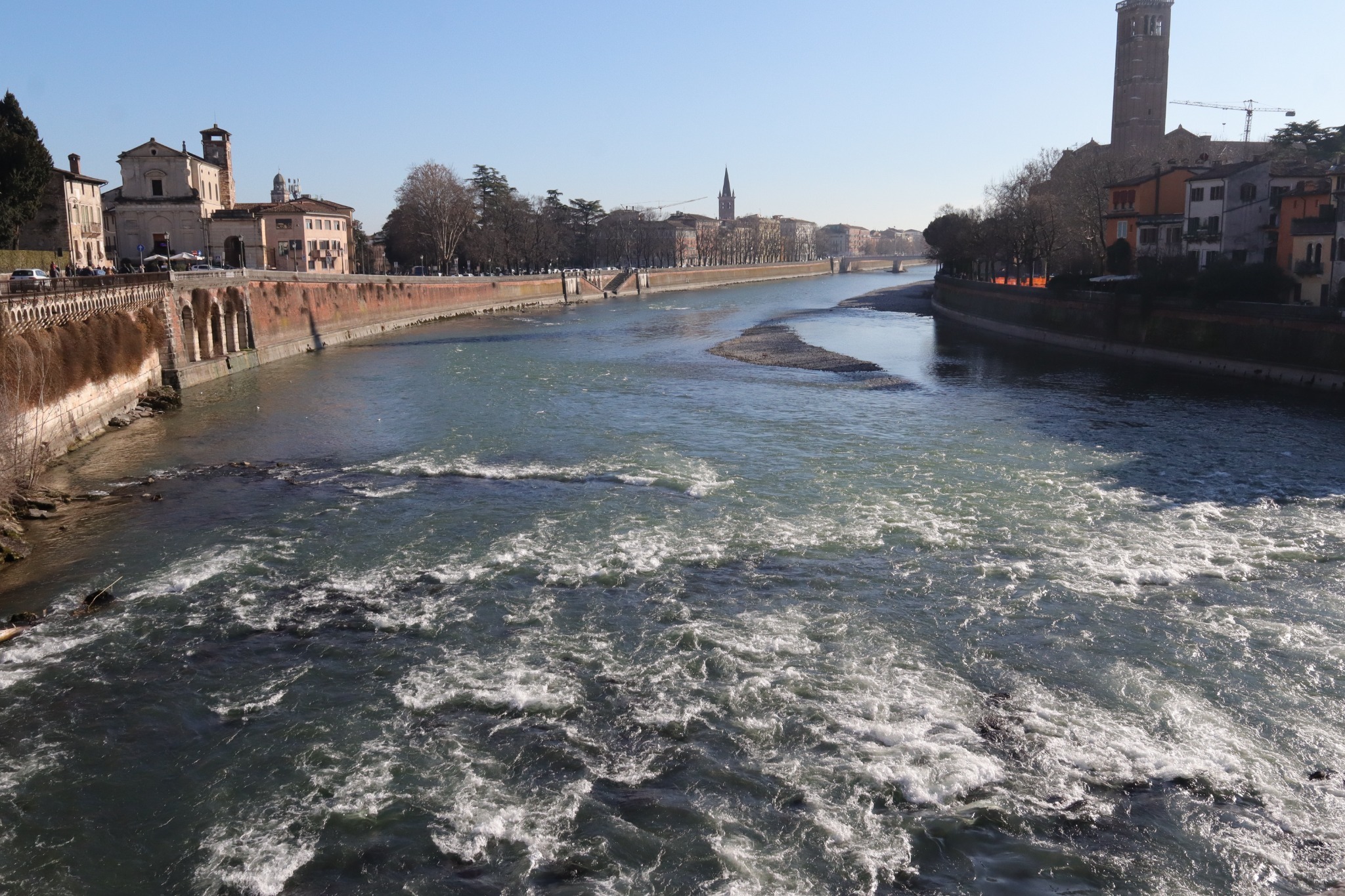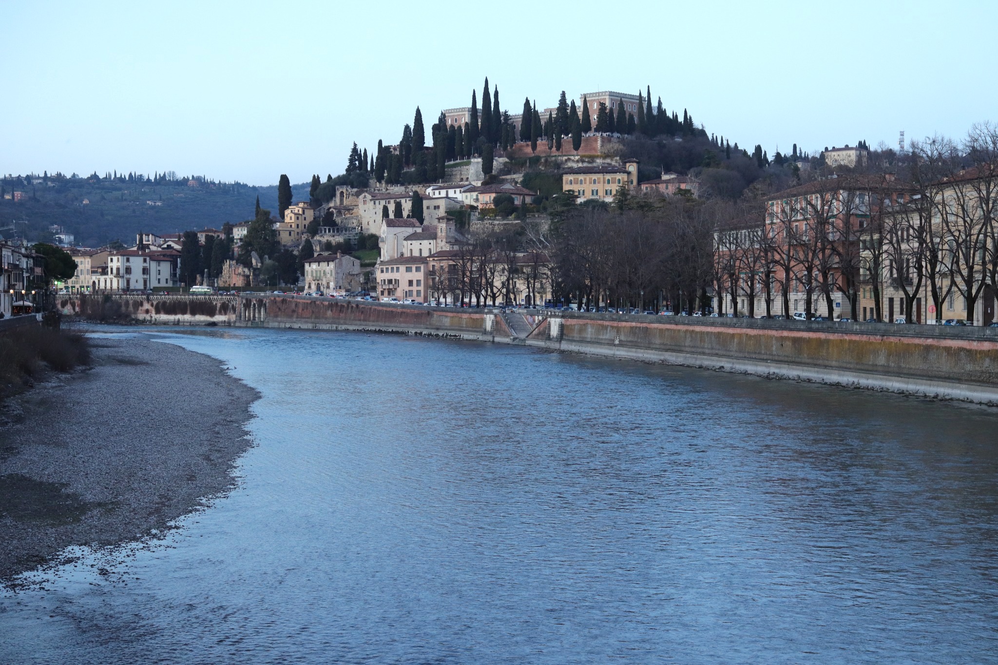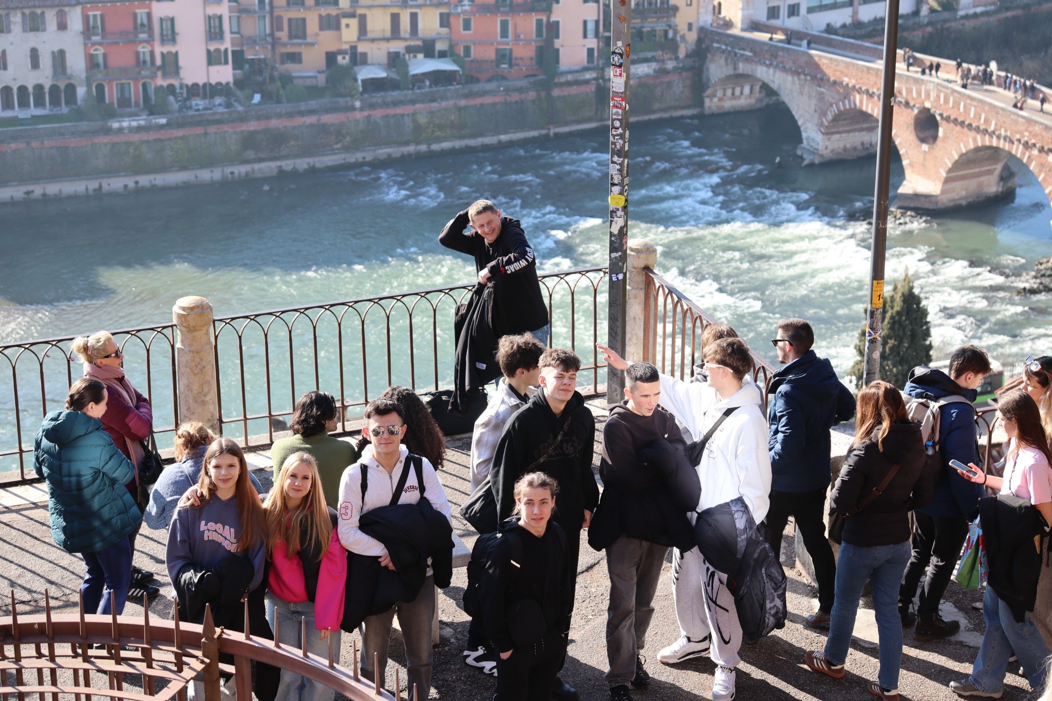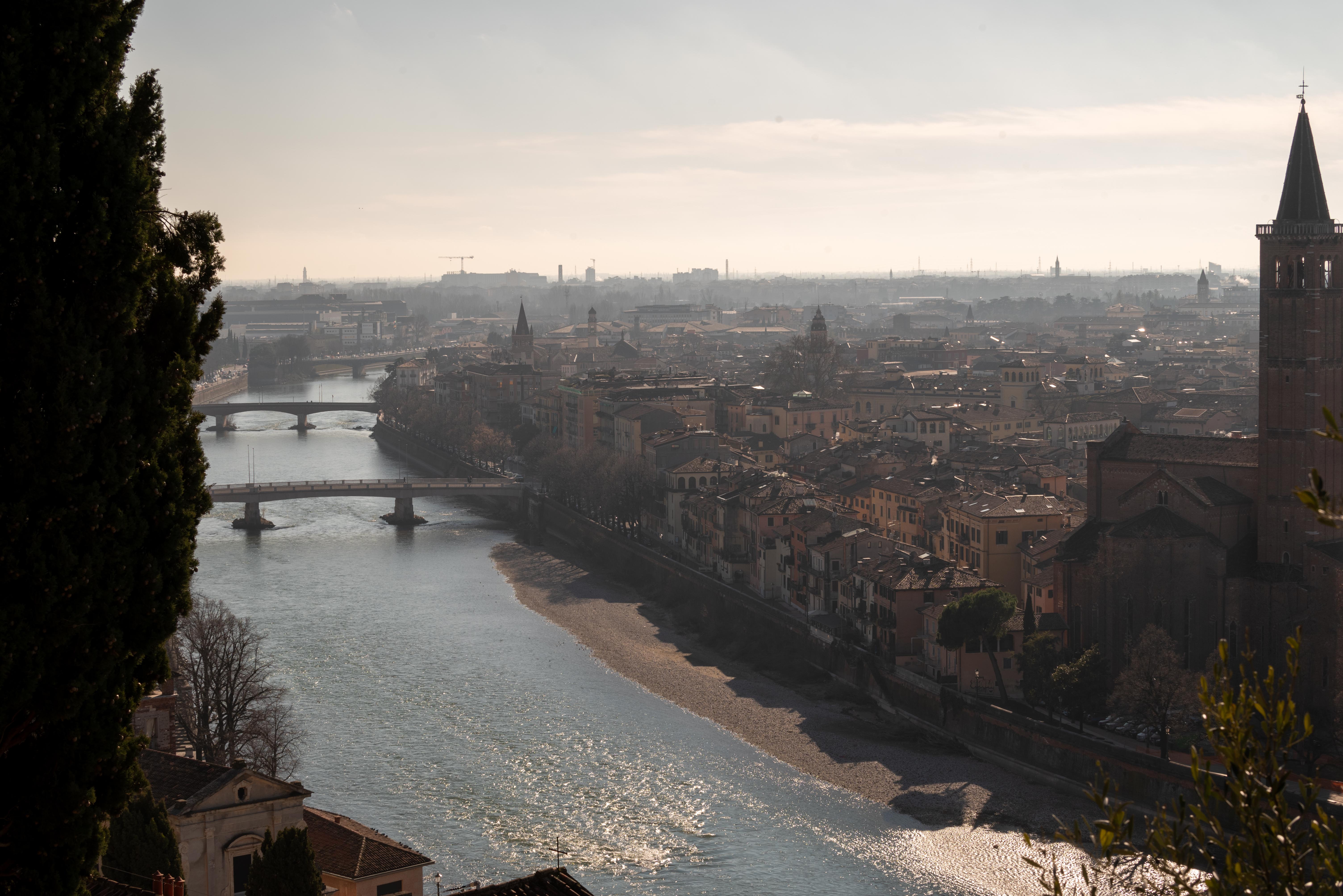 Potem Werona pokazała swój rytm na placach: Piazza delle Erbe, gdzie codzienność miesza się z historią, oraz Piazza dei Signori z akcentem Dantego i „poważniejszą” stroną miasta. Zwieńczeniem spaceru była Arena na Piazza Bra – mocny znak tego, jak przemija potęga świata, a zostaje świadectwo czasu zapisane w kamieniu. To naturalnie prowadziło do bardziej cichego momentu: przejścia w stronę rzeki i panoramy.