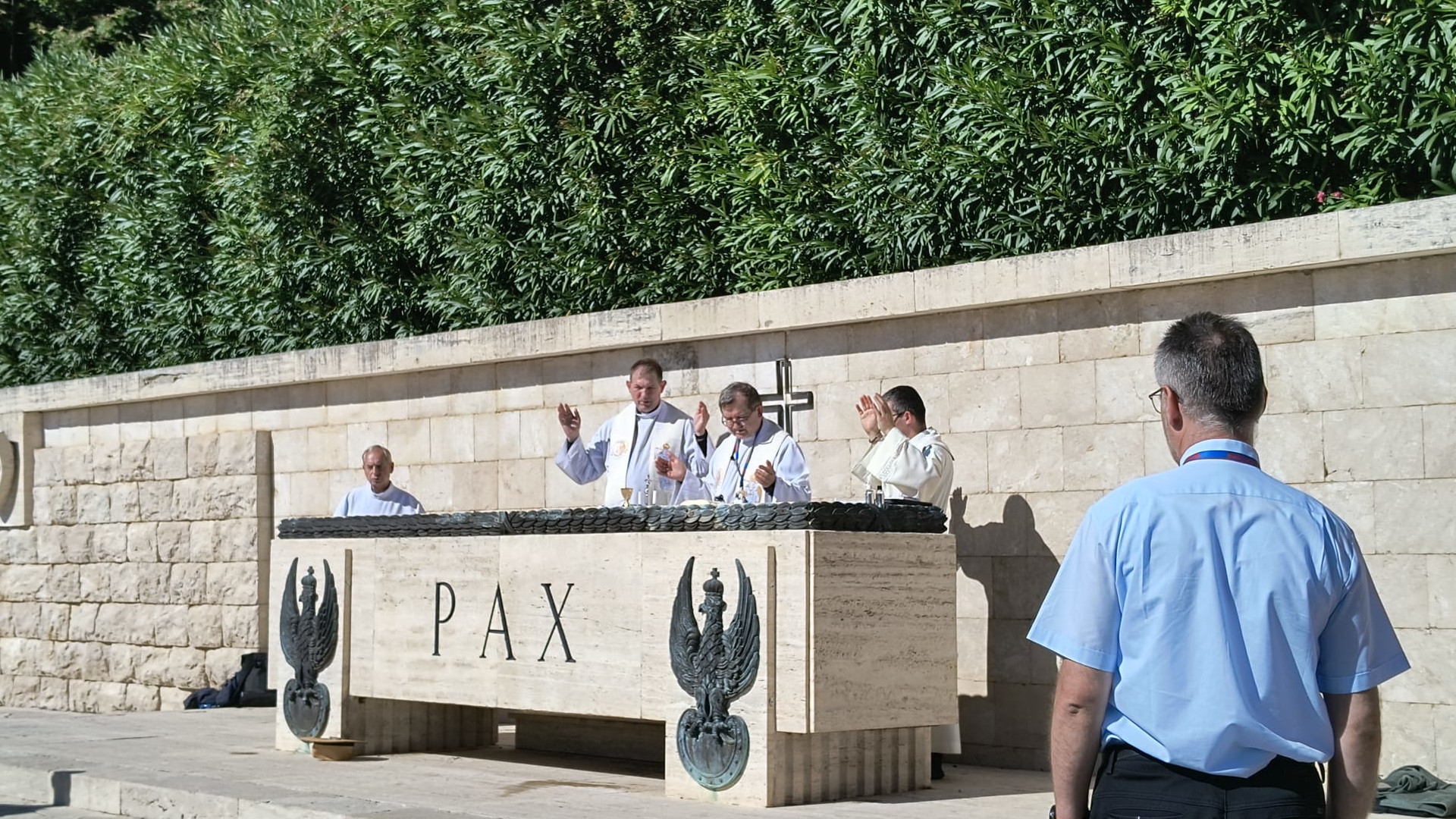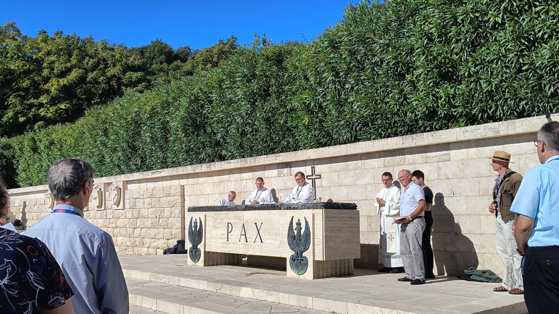 Ponieważ przyjechaliśmy w czasie sjesty nie mogliśmy odprawić Mszy św. w Bazylice, udaliśmy się więc na położony w dolinie Polski Cmentarz Wojennym, gdzie odprawiliśmy Najświętszą Ofiarę modląc się za poległych w intencji poległych żołnierzy 2 Korpusu Polskiego, którzy zginęli w walkach o wyzwolenie Włoch w latach 1944-1945. Na cmentarzu spoczywają ci, którzy przeżyli Monte Cassino, Ankonę, Bolonię – ale nie doczekali powrotu do Ojczyzny. Ich groby, równo ustawione, mówią więcej niż słowa.